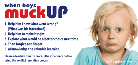 As rooster children tend to have a heightened sense of their own importance, moments of failure cut very deeply, especially for boys. Often this can create an internal cycle of self-loathing and many teenage boys and men have told me that being punished and shamed for struggling to cope with moments of failure, has created negative mindsets and thinking patterns that they still struggle with as adults. We must take the time to help boys when they muck up with this simple process.