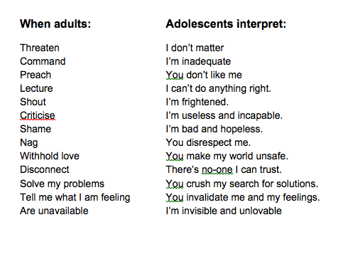 Caring, empowering communication indicates an ability to understand another’s reality, a process which can be difficult when there is a difference of culture, age, gender or significant life experience. We often assume that others understand us when they can have a very different view point. Here are some possible different interpretations that can occur with adolescents.